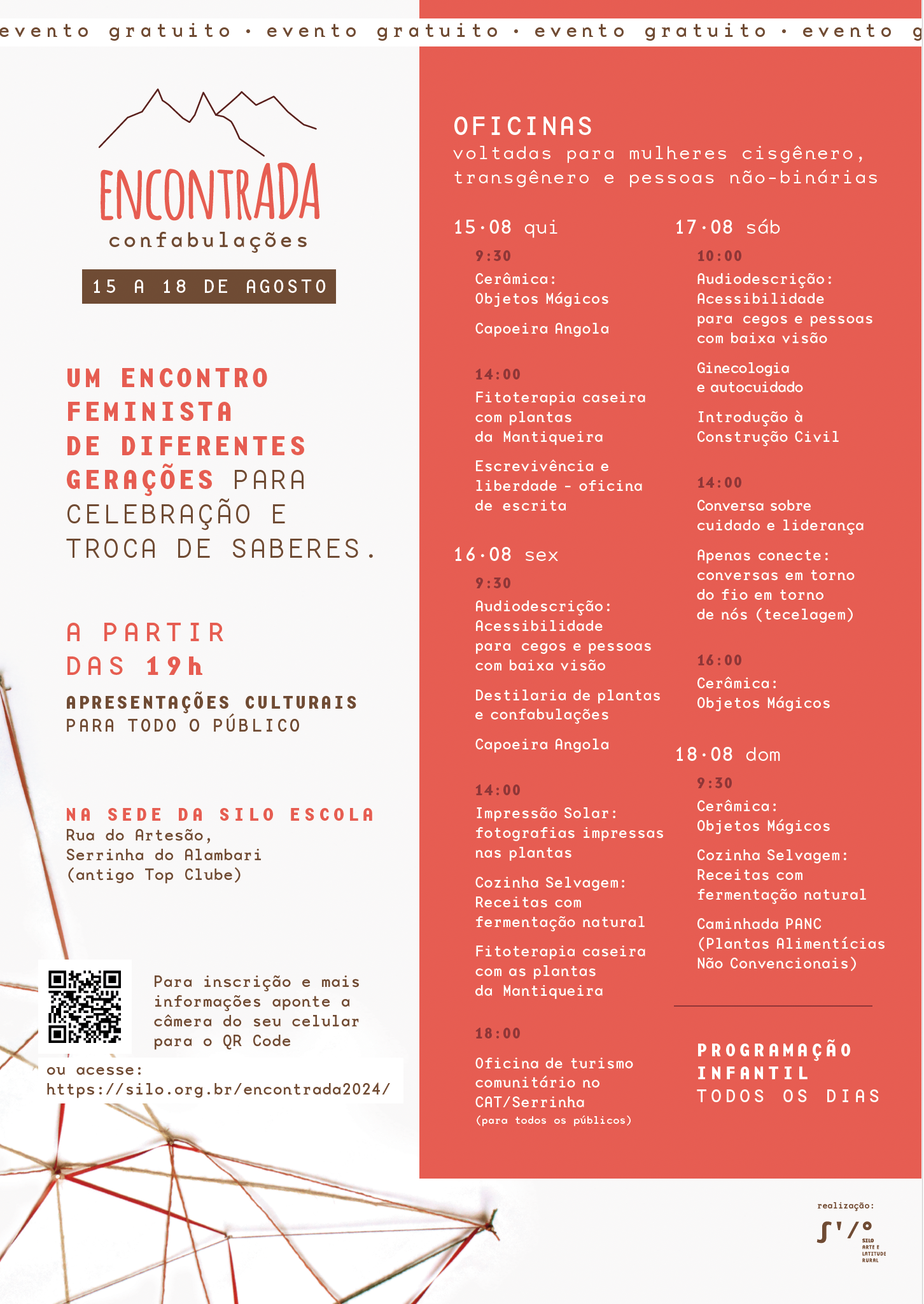 A Encontrada é um evento da Silo - Arte e Latitude Rural voltado para mulheres (cis e trans) e pessoas não binárias. Seu foco é a troca de conhecimento entre diferentes gerações, culturas, raças, histórias de vida, entre outros. O encontro oferece oficinas, diálogos e experiências que quebram paradigmas, fortalecem as envolvidas, e promovem a união e geração de novas conexões.