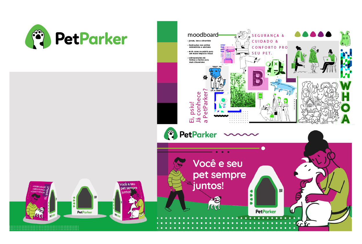 A imersão no dia a dia do usuário foi a base de todo o desdobramento dos materiais da PetParker. Por meio de visitas às estações que já estavam instaladas na cidade de São Paulo, foi possível entender e mapear as dificuldades e a interação entre tutores e animais ao utilizarem o serviço. A estação era pouco notada por pedestres e clientes dos estabelecimentos. Era preciso criar uma paleta de cores que dialogasse com a marca e trouxesse destaque às casinhas nos diversos locais onde estão inseridas, assim como ilustrações, recursos gráficos e um tom de voz que despertasse a curiosidade, informasse o propósito do serviço e criasse conexão emocional com os tutores de animais.